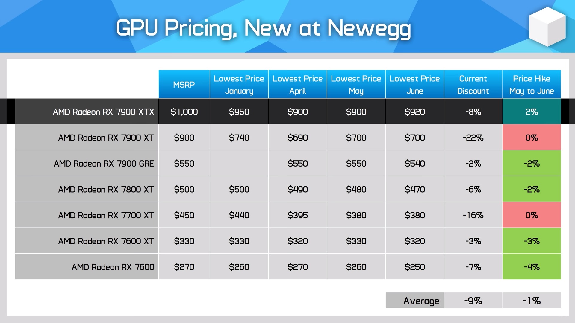 Прежде всего обратите внимание на таблицу выше. Здесь вы можете увидеть изменения стоимости видеокарт NVIDIA текущего поколения начиная с января текущего года. Первый столбец представляет собой рекомендованную цену в США и плохо соответствует реальному положению на рынке. Именно поэтому обратимся ко второму столбцу, где указана стоимость тех или иных графических чипов на начало января. Пропустим несколько столбцов, поскольку нас интересуют данные за июнь 2024. Таким образом мы можем узнать, как изменилась реальные цены на видеокарты в США за 5 месяцев. Как видите, хорошего мало, ведь линейка подешевела всего на 2%, ну а это практически не заметно, ведь мы имеем дело с сотнями моделей. Ценовая политика у конечных производителей сильно разнится, а значит считающиеся себя брендовыми компании будут предлагать видеокарты намного выше рекомендованной стоимости. Всё это значит только одно: спустя полтора года после релиза серии GeForce RTX 40, стоимость видеокарт остаётся без изменений, а значит тактика ждунов не сработала. Руководство NVIDIA не планирует устраивать щедрую распродажу, ну а мы попробуем поискать удачи в лагере AMD.