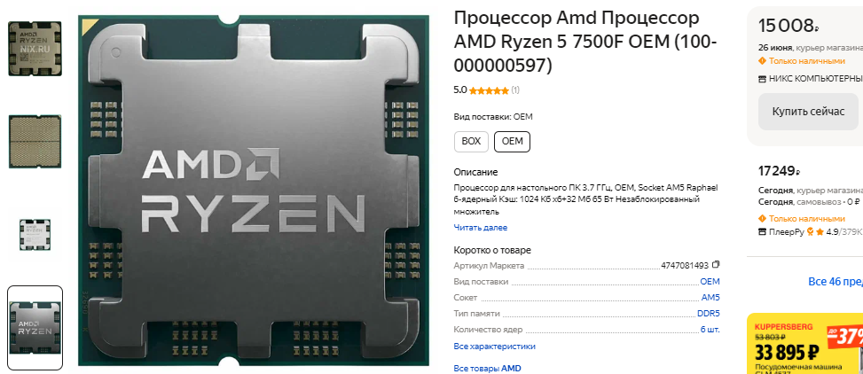В качестве основы нашего системного блока возьмём Ryzen 5 7500F. Процессор AMD уже на рез становился самым продаваемым на глобальном рынке, поскольку предлагает отличную производительность по разумной цене. Купить такой камень вы можете всего за 15 тысяч рублей, что намного дешевле, чем просит за аналогичные по скоростным показателям процессоры Intel. Ryzen 5 7500F можно не менять, когда вам потребуется купить видеокарту следующего поколения, ну а принадлежность к сокету АМ5 позволяет надеяться на длительный жизненный цикл. Инсайдеры полагают, что кроме серии процессоров Ryzen 9000, которая поступит на прилавки магазинов уже этим летом, в 2026 нас ждёт ещё одна линейка, которая будет поддерживать сокет АМ5. Таким образом вы сможете усилить свой компьютер спустя много лет, потратив на это минимум средств. Сегодня Ryzen 5 7500F отлично справляется со всеми задачами и будет тянуть видеокарты средневысокого сегмента, полностью раскрывая их потенциал.