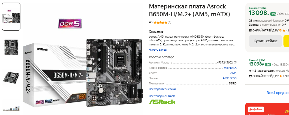 Можно было бы взять материнскую плату до 10 тысяч рублей, но в данном случае мы предлагаем вам не экономить. Указанный выше процессор имеет теплопакет не выше 65 Вт и может быть установлен на материнскую плату с чипсетом А620. Представьте себе, что через пару лет вам захочется усилить свой компьютер за счёт более мощного процессора, но из-за ограничений материнской платы сделать это будет нельзя. Именно поэтому берём Asrock на чипсете В650. Данная плата стоит 13 тысяч и имеет всё необходимое, для построения перспективного игрового компьютера. На самом деле мы не станем задействовать весь потенциал материнской платы, поскольку в данном случае в этом нет никакой необходимости.