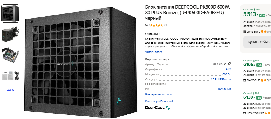 Поскольку мы собрали не самую требовательную игровую систему, то можно не усердствовать с выбором блока питания. Подойдёт DEEPCOOL PK600D мощностью 600 Вт. Ставить на такой компьютер флагманскую видеокарту не стоит, но обычно подобные комплектующие обходятся не дешевле 150-250 тысяч рублей, что дороже, чем весь наш ПК. Блок питания надёжный и поддерживает стандарт энергоэффективности 80 PLUS Bronze. Если вы не станете смотреть в сторону более мощных процессоров и видеокарт в будущем, то можно смело использовать DEEPCOOL PK600D и для следующей сборки.