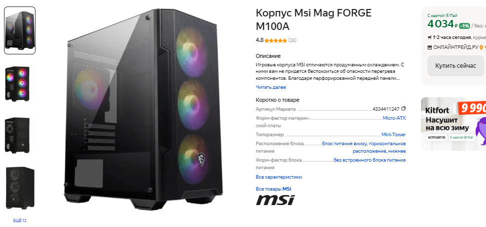 Всё это упаковываем в корпус Msi Mag FORGE M100A, отличающийся низкой стоимостью и продуманной конструкцией. Внутри есть место для всех наших комплектующих, а также достаточно пространства для энтузиастов, которые захотят добавить жёсткий диск или заменить в будущем видеокарту. Системный блок не будет навязчиво гудеть, поскольку все комплектующие принадлежат к среднему ценовому сегменту и не призваны бить рекорды скорости. Несмотря на это для отвода лишнего тепла предусмотрены 4 вентилятора. Также есть пылевая решётка, ну а в целом выбором корпуса останутся довольны даже те, кто подходит к этому вопросу с особыми требованиями. После подсчёта стоимости всех компонентов удалось выяснить, что мы уложились в 95 тысяч рублей. Прибавьте к этому термопасту и кулер процессора, без которого работа наш ПК не сможет. Как уже было сказано выше, мы не преследовали задачу экономить на каждом выбранном компоненте. Такая тактика позволила бы скинуть не больше десяти тысяч, но привела бы к плачевным результатам. Ну а в данном случае мы получили очень неплохой и перспективный компьютер, который сможет обеспечить приличную производительность в любых играх ещё несколько лет.