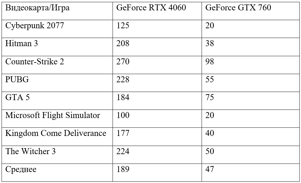 Прежде всего предлагаем вам обратиться к сводной таблице, где собраны результаты со всех участвующих в тестировании игр. Как видите, GeForce RTX 4060 набирает около 190 кадров в секунду, что оказывается достаточно для комфортной игры в разрешении 1080р. Удивительно, но даже GeForce GTX 760 способна демонстрировать приличную производительность. Фрамрейт старой видеокарты равен 47 fps, но здесь нужно обратить внимание на детали. Как видите, в не самых требовательных играх GeForce GTX 760 показывает себя относительно неплохо. Например, в Counter-Strike 2 удаётся получить 98 кадров в секунду, тогда как в GTA 5 фрамрейт и вовсе достигает 75 fps. И всё бы ничего, вот только в требовательных новинках старая видеокарта ведёт себя совершенно иначе. В Cyberpunk 2077 получить больше 20 кадров в секунду не выйдет, а значит придётся снижать настройки графики. В целом для некоторых игр GeForce GTX 760 подходит, но жизненный цикл видеокарты уже давно подошёл к концу.