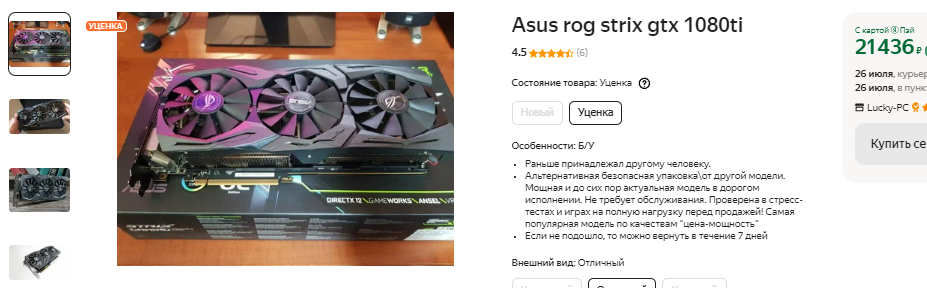 Найти новую GeForce GTX 1080 Ti уже невозможно, но несколько старых флагманов всё ещё доступно на вторичном рынке. Купить рабочую видеокарту можно за 21 500 рублей. Если немного поиграть с настройками, как это сделал NJ Tech, то можно добиться почти стабильных 60 кадров в секунду во всех играх. Такой результат кажется неплохим, но в реальности вы получаете кота в мешке. В данном случае речь идёт о магазине, но большая часть геймеров покупает старые видеокарты на Авито и других аналогичных площадках. Даже на «ЯндексМаркете» вам не скажут, кто был предыдущим владельцем. Это значит, что GeForce GTX 1080 Ti могла ремонтироваться, а до этого годами работала на ферме, копая криптовалюту в режиме 24/7. Не все продавцы честные, ну а мошенники могут подсунуть вам сгоревший графический чип или видеокарту, имеющую те или иные скрытые проблемы. Рекомендовать вам GeForce GTX 1080 Ti на вторичном рынке мы не можем, но в целом это же относится и к многим другим видеокартам.
