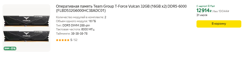 Не будем тратиться и на оперативную память, ведь тесты доказывают, что между флагманскими линейками и бодрыми середняками разница не превышает несколько процентов. Порой заметить прирост быстродействия вы сможете только в синтетических тестах, тогда как опустевший кошелёк спасибо вам точно не скажет. Берём две линейки по 16 Гб народной DDR5-6000 производства Team Group. Линейка T-Force Vulcan на фоне конкурентов смотрится неплохо и в целом соответствует заявленным показателям. Энтузиасты могут воспользоваться настройкой таймингов, ну или можно выбрать автоматические настройки на материнской плате. Покупать 16 Гб в 2024 году мы не рекомендуем, да и цена на оперативную память не такая большая, чтобы экономить на мелочах.