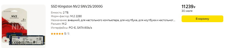 Даже если бы купили дорогую материнскую плату, то тратиться на твердотельный накопитель нет никакого смысла. Тесты доказывают, что даже самые примитивные SSD демонстрируют в игровых сценариях показатели, сходные с флагманскими моделями. Да, в синтетических тестах владелец жутко дорогого твердотельного накопителя с поддержкой интерфейса PCIe 5.0 сможет порадовать своё эго, но всё это никак не отразится на реальных сценариях. Именно поэтому выбираем народный Kingston NV2. Скорость чтения и записи здесь позволяет не думать об ожидании загрузки игровых сцен, а в целом производительность вашего компьютера окажется максимально возможной. Берите сразу 2 Тб, ведь игры становятся всё более объёмными, а иногда хочется записать на ПК фильмы, музыку и другие полезные файлы. Такое количество свободной памяти позволяет себя не ограничивать, но стоит довольно недорого.