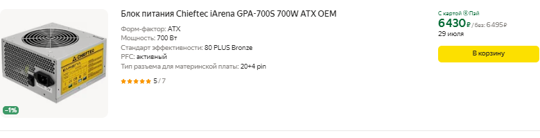 Без хорошего блока питания никак не обойтись. Мы предлагаем купить Chieftec мощностью 700 Вт. Диванные эксперты скажут, что есть и более надёжные устройства, и будут правы. Вот только мы не ставили перед собой цель купить самый дорогой блок питания. Chieftec имеет целую армию фанатов и предлагает пристойное качество по разумной цене. К тому же, данный блок питания поддерживает стандарт энергоэффективности 80 PLUS Bronze. Наша система будет работать тихо и стабильно, ведь мощности блока питания окажется даже больше, чем потребуется. Оставим потенциал для следующего апгрейда.