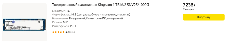 Не указывают немецкие сборщики и производителя твердотельного накопителя. В данном случае мы гадать не будем, остановив выбор на бренде Kingston. В сборке заявлен SSD объёмом 1 Тб, ну а такой в российской рознице стоит чуть дороже 7 тысяч рублей. Для размещения игр, хранения домашнего видео и фотографий хватит, но придётся постоянно контролировать свободный объём, удаляя наименее нужные файлы. Мы бы порекомендовали купить твердотельный накопитель ёмкостью 2 Тб, но в данном случае руководствуемся готовой сборкой. У многих наших читателей уже есть твердотельные накопители или жёсткие диски, ну а это позволит увеличить количество физической памяти на компьютере.