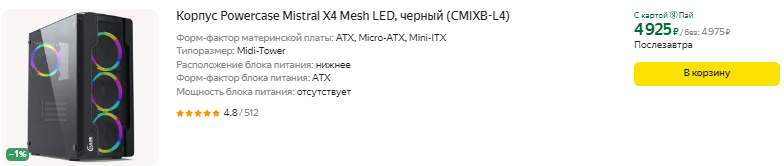 Найти блок питания производства Corsair нам не удалось, поэтому бы берём аналогичный по характеристикам Chieftec BDK-750FC. Он также предлагает мощность 750 Вт и соответствует стандарту энергоэффективности 80 PLUS Bronze. Блок питания надёжный и будет работать ещё очень много лет. Даже если вы захотите сделать апгрейд, мощности его будет достаточно, ну а в текущей сборке Chieftec BDK-750FC предложит тихую работу, поскольку имеет значительный запас мощности. Похожий на установленный немецкими сборщиками системный блок Powercase Mistral X4 Mesh LED в российской рознице стоит 5 тысяч рублей. Он оснащён закалённым стеклом и содержит все необходимые разъёмы для ввода и вывода информации. Охлаждение осуществляется за счёт комплектных кулеров, ну а в целом корпус будет выглядеть прилично и даже красиво.