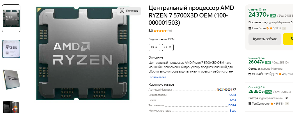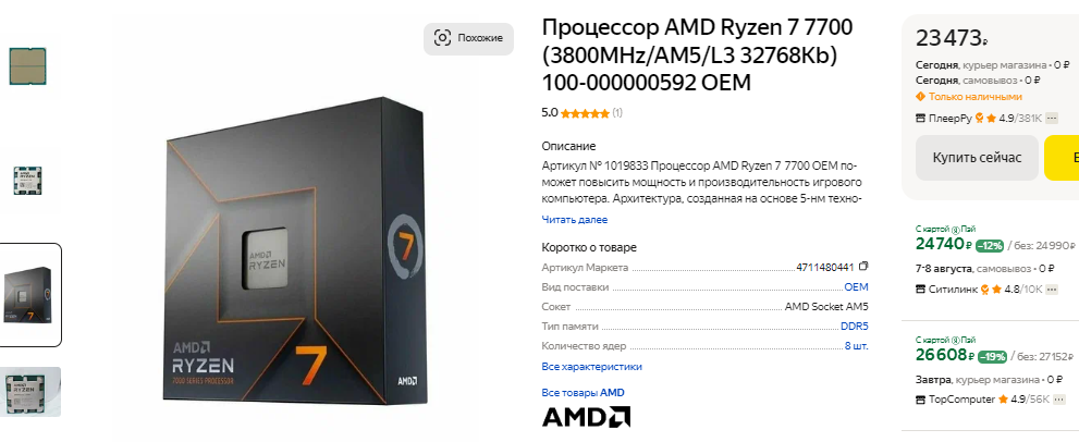 Именно поэтому мы предлагаем вам два процессора, которые идеально подходят для указанных выше видеокарт. Для тех, кто планирует часто обновлять системный блок, лучше подойдёт Ryzen 7 7700. Процессор подключается к материнской плате через сокет АМ5, ну а данная платформа останется актуальна ещё как минимум 3 года. Проблема лишь в том, что материнские платы под АМ5 стоят недёшево, а за оперативную память придётся заплатить существенно дороже. К сожалению, без дополнительных растрат не обойтись, ну а в итоге многие геймеры предпочитают использовать старую платформу АМ4. Здесь в качестве оптимального решения мы предлагаем остановиться на Ryzen 7 5700X3D. По скоростным показателям оба процессора почти ничем не отличаются, но сборка на базе последнего будет дешевле на 15-20 тысяч рублей только за счёт материнской платы и оперативной памяти. Ryzen 7 5700X3D часто покупают те, кто уже имеет компьютер на базе АМ4. В этом случае экономия окажется ещё выше, ведь достаточно заменить процессор, поставить более мощную видеокарту Radeon RX 7700 XT, наслаждаясь картинкой максимального качества в разрешении 2К.