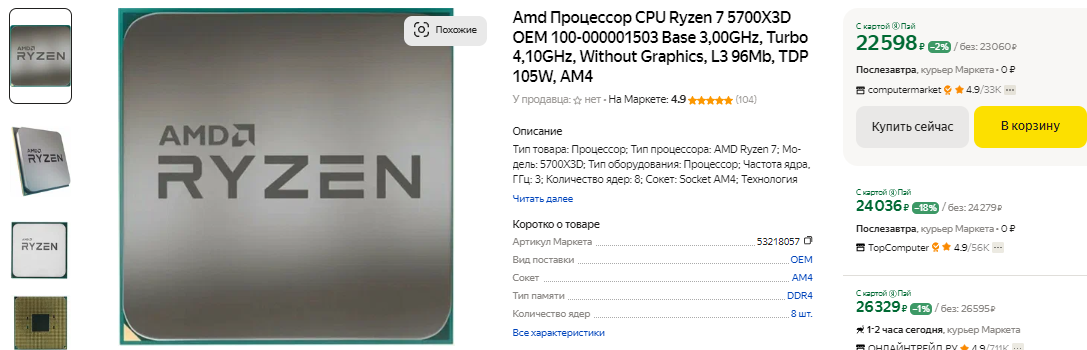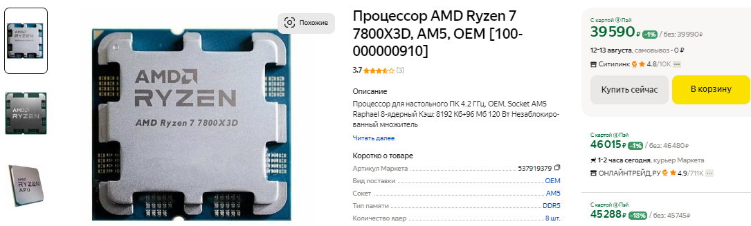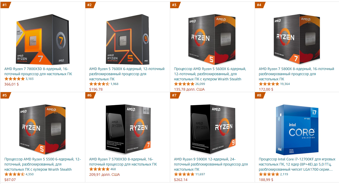 В число наиболее популярных попал и Ryzen 5 5500, самое главное преимущество которого кроется в цене. Рекомендовать такой камень мы можем только для офисных задач, но в целом он неплохо справится с построением рабочего места для школьника. За счёт возможности использования платформы АМ4 и низких требований системный блок на базе Ryzen 5 5500 будет стоить вам копейки. Вполне заслуженно в число наиболее популярных входит и Ryzen 7 5700X3D. Это один из самых быстрых игровых процессоров, подходящий для материнских плат с сокетом АМ4. В российской рознице камень обойдётся вам дороже, чем в США, но разница не очень большая. Если задуматься, то гораздо выгоднее инвестировать средства в покупку Ryzen 7 5700X3D, добавив мощную видеокарту, чем переплачивать за Ryzen 7 9700X. Повторимся, что официальных данных о продажах по всему миру процессоров серии Ryzen 9000 пока нет, но обычно результаты коррелируют со статистикой по Amazon.