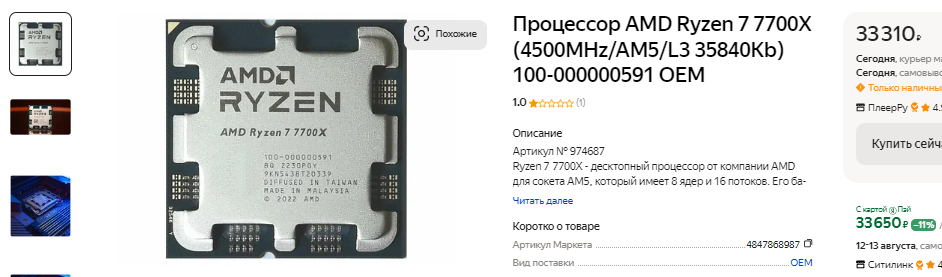 Как видите, за Ryzen 7 7800X3D в российском магазине просят меньше 40 тысяч рублей. А между тем это самый быстрый игровой процессор на рынке. Да, Ryzen 7 9700X очень неплох, но в данном случае не очень понятно, сколько в таком случае должен этот камень стоить на старте продаж? Пожалуй, ответить на этот вопрос нам поможет американская розница. Смотрите, Ryzen 7 9700X там предлагается за рекомендованные 359 долларов, что в целом характерно для данного рынка. Ryzen 7 7800X3D на 7 долларов дороже, что вполне понятно, ведь данный камень всё же немного быстрее. Ну а за Ryzen 7 7700X просят всего 277 долларов. Если перевести эту сумму в российскую валюту, то получится 25 тысяч рублей, а это очень приличная скидка.