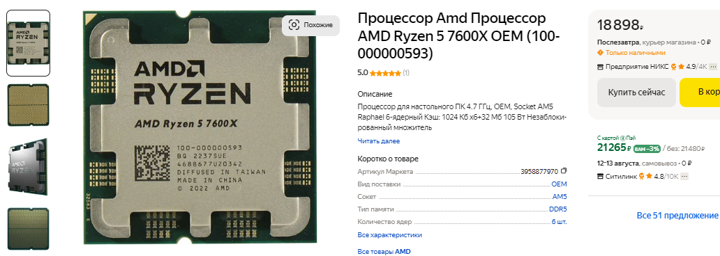 К примеру, на втором месте Ryzen 5 7600X, который сегодня в российской рознице вы можете купить за 19 тысяч рублей. В американской рознице стоимость почти не отличается, ну а это сделало этот процессор одним из самых популярных на рынке. Он способен обеспечивать отличные показатели в игровых сценариях, но намного дешевле 8-ядерного новичка. На третьем месте располагается Ryzen 5 5600X, который вышел в далёком 2020 году, но до сих пор продолжает интересовать рядовых пользователей. Стоит такой камень недорого, позволяя собрать вполне актуальный компьютер для решения повседневных задач. С играми Ryzen 5 5600X справляется не так хорошо, как Ryzen 5 7600X, но для запуска интернета и даже игр с недорогой видеокартой подойдёт идеально.