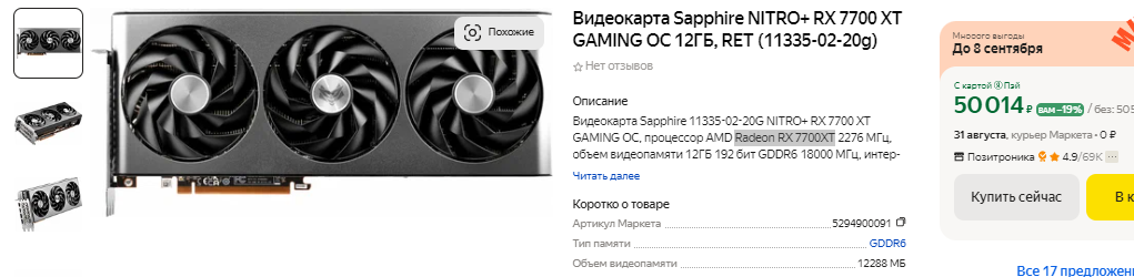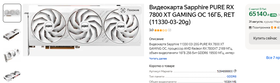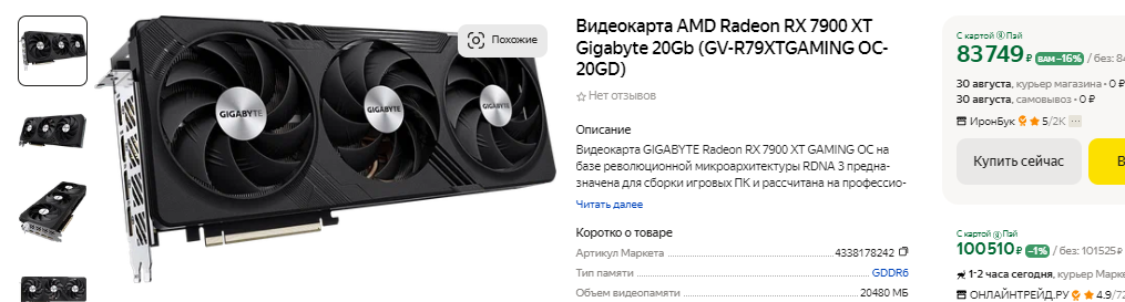 Ну и за 84 тысяч в наличии Radeon RX 7900 XT. Это настоящий игровой монстр, которому может покориться даже самая требовательная игра в разрешении 4К. 20 Гб памяти хватает с избытком, ну а это не самая дорогая и мощная видеокарта. На самом деле даже такой производительности достаточно, ну а Radeon RX 7900 XT славится отличным потенциалом. Она легко справляется с трассировкой лучей и стоит намного дороже аналогов NVIDIA текущего поколения. Если учитывать, что видеокарты подорожают на 10%, то уже к началу 2025 Radeon RX 7900 XT будет продаваться не дешевле 100 000 рублей.