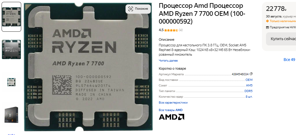 Ну а поскольку без процессора собрать компьютер невозможно, то давайте изучим несколько наиболее интересных продуктов AMD. Геймерам точно понравится Ryzen 7 7700, обладающий отличными скоростными показателями и способным раскрыть потенциал даже самой дорогой видеокарты. При этом Ryzen 7 7700 ещё и не слишком требовательный, поскольку имеет TDP на уровне 65 Вт. Под такой камень вы можете купить недорогую материнскую плату, но большего и не потребуется.