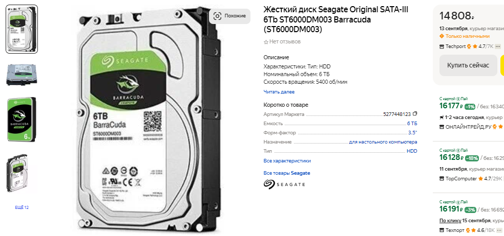 Начнём с жёсткого диска производства Seagate ёмкостью 6 Тб. Пожалуй, такого количества хватит большинству пользователей. Сюда поместится полноценная библиотека лучших фильмов и сериалов. Эксперты пишут, что выгоднее покупать HDD от 4 Тб, поскольку соотношение между ценой и ёмкостью там наиболее оптимальное. Выбранными нами жёсткий диск отлично вписывается в эту концепцию и стоит около 15 тысяч рублей.