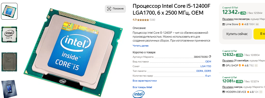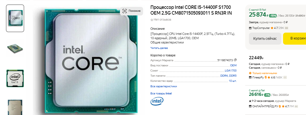 А вот Core i5-14400F покупать крайне не советуем. Здесь главная причина в высокой стоимости. Сравните, в продаже есть Core i5-12400F, за который просят ровно в 2 раза дешевле. Так вот, если запустить оба камня в игровом тестировании с видеокартой до 40 тысяч рублей, то разница в быстродействии окажется близкой к нулевой. В идеальных сценариях Core i5-14400F определённо быстрее, но увидеть преимущество более нового камня вам никогда не удастся. Именно поэтому переплачивать за принадлежность к самому последнему поколению нет никакого смысла. Core i5-12400F неплохо справляется с играми и в целом может рекомендоваться как более скоростная замена указанному выше Ryzen 5 5600. Материнские платы под процессор Intel стоят недорого, а возможность купить оперативную память стандарта DDR4 позволяет сэкономить ещё несколько тысяч рублей.