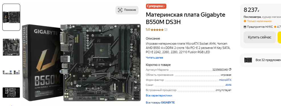 Можно было бы неплохо сэкономить на материнской плате, вот только мы собираем аналог PlayStation 5 Pro, а значит должны учитывать её главные фишки. Здесь ключевая особенность заключается в скоростном SSD, который позволяет сократить время загрузки игр и добиться минимальных переходов между уровнями. Придётся купить Gigabyte B550M DS3H, построенную на чипсете В550. В ней присутствуют все нужные интерфейсы, а также доступен скоростной PCIe 4.0. Материнская плата позволяет экспериментировать с разгоном, но в данном случае нас волнует только то, что она позволит не отстать от игровой приставки по показателю быстродействия твердотельного накопителя.