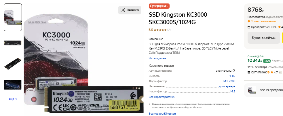 Дабы не выйти за пределы указанных выше 90 тысяч, мы остановимся на SSD Kingston KC3000. Твердотельный накопитель отличается крайне высокой скоростью чтения и записи до 7000 МБ/с, что позволит раскрыть потенциал всех наших комплектующих. Поскольку консоль включает накопитель ёмкостью 1 Тб, то мы возьмём такой же объём. Для записи игр нам хватит, тогда как операционная система и программы в любом случае займут не больше 100 Гб. В продаже можно встретить твердотельные накопители и быстрее, но мы очень сомневаемся, что в реальных играх они покажут лучшие показатели. На самом деле даже выбранный SSD для игр слишком быстрый, но мы решили соответствовать PlayStation 5 Pro, а значит выбора не было. Твердотельный накопитель имеет отличные показатели выносливости. Он способен проработать 2 миллиона часов, и записать 800 Тб информации. Этого хватит на десять лет, даже если вы начнёте закачивать в день по одной игре размером 100 Гб.