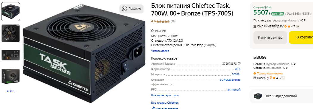 Внутри игровой приставки скрывается крайне бюджетный, но качественный блок питания и мы вынуждены уделить этой детали особое внимание. Дабы сэкономить, остановимся на Chieftec Task. Мощность блока составляет 700 Вт, значит для обеспечения стабильной работы нашего ПК вполне достаточно. В придачу идёт поддержка стандарта энергоэффективности 80+ Bronze, что говорит о качестве блока питания.
