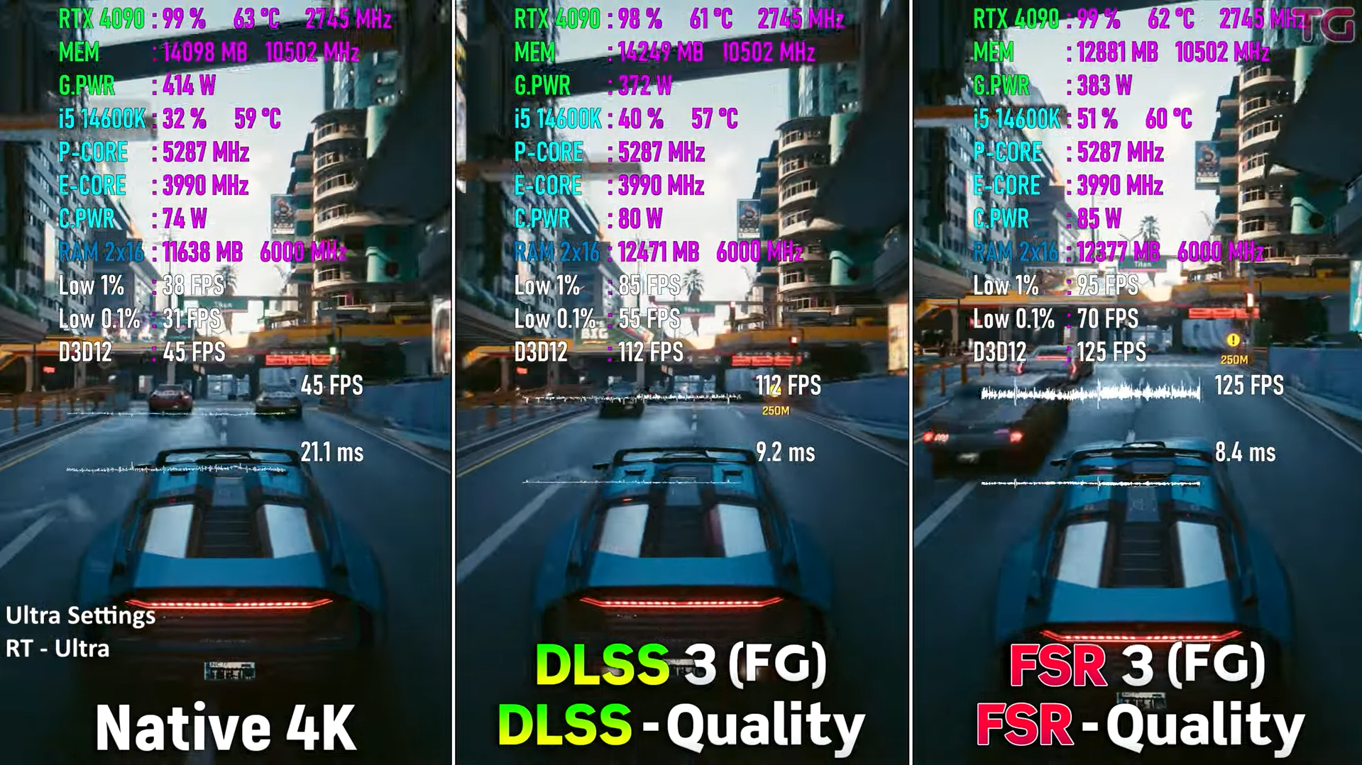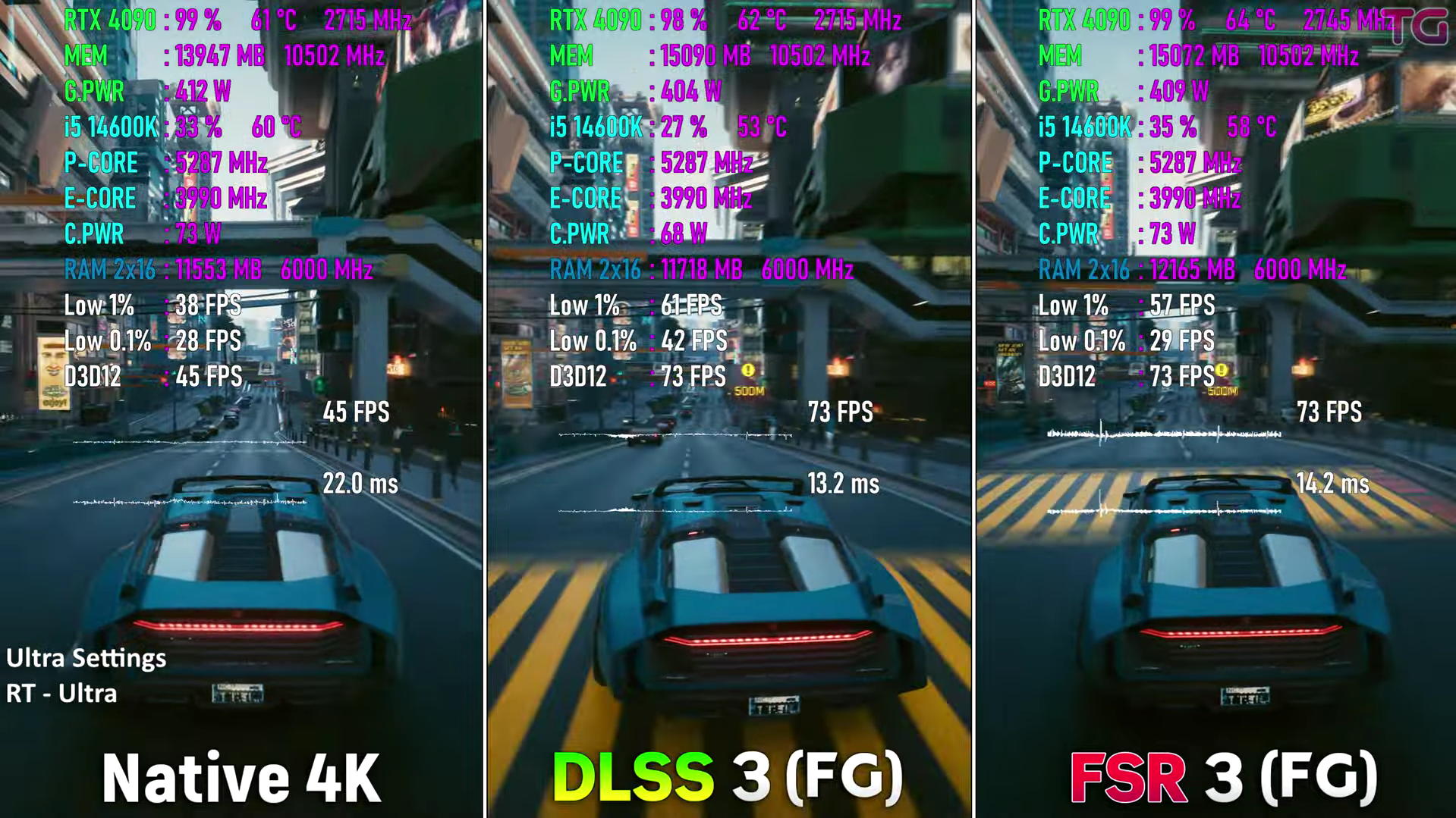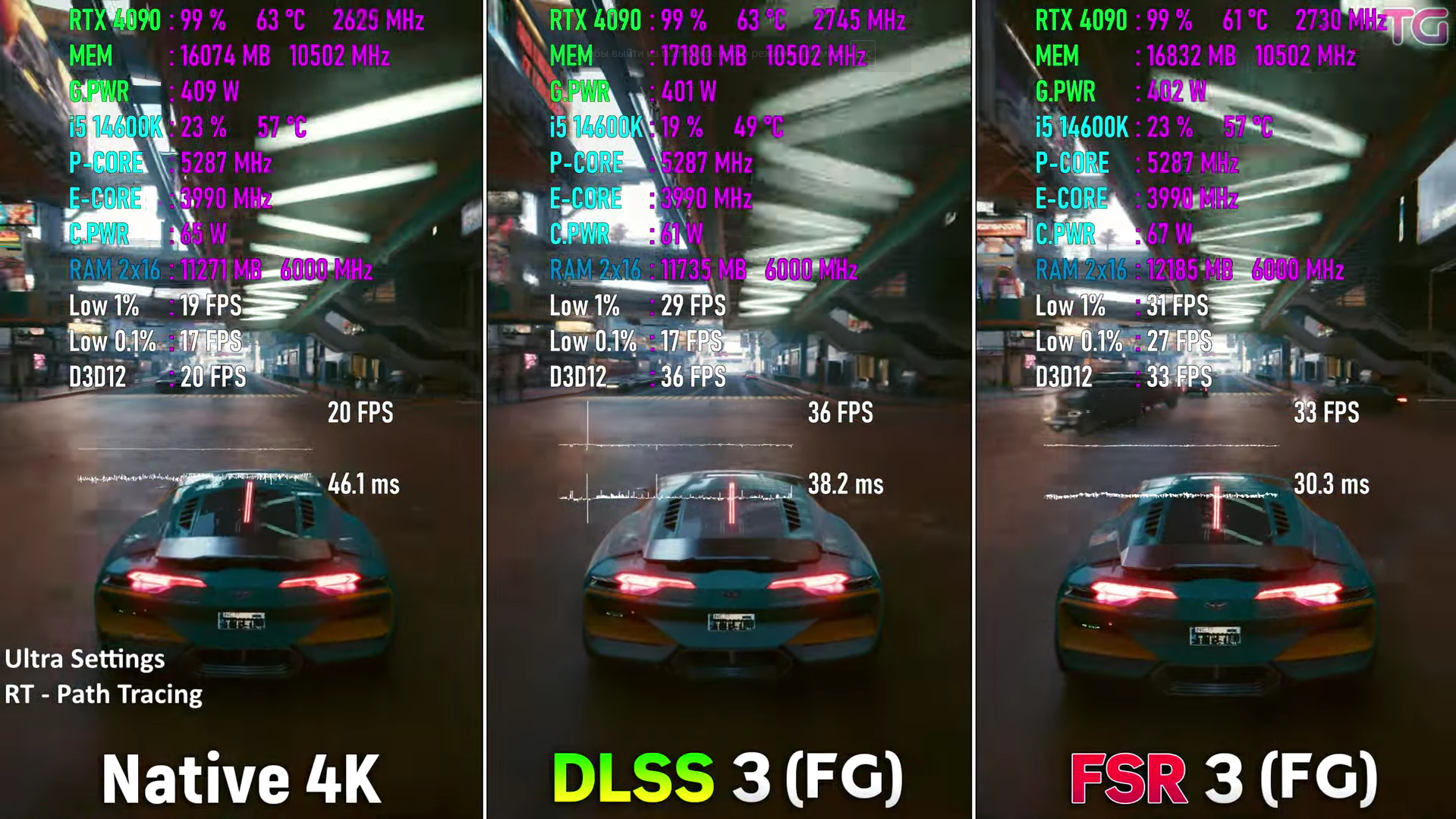 К сожалению, рынок настольной графики контролирует Дженсен Хуанг, и он же задаёт правила игры. Так вышло, что большая часть владельцев видеокарт NVIDIA прошлых двух поколений даже не знает о возможности запуска FSR 3, тогда как DLSS 2 предлагает менее впечатляющие алгоритмы масштабирования. Картинка там более размыта, а количество кадров в секунду ниже. Но и это ещё не всё, ведь по состоянию на конец августа DLSS 3 была доступна на 100 играх, тогда как FSR 3 – всего на 50. Вот и получается, что кажущиеся преимущества на самом деле на рынке не востребованы, а NVIDIA продолжает продавать не самый лучший продукт по завышенным ценам. Но вернёмся к тестированию. Как видите, если запустить Cyberpunk 2077 с трассировкой лучей в разрешении 4К на видеокарте GeForce RTX 4090, то количество кадров в секунду снижается до 45 единиц. Это значит, что сегодня даже самый дорогой суперфлагман не способен обеспечить стабильные 60 fps в 4К на максимальных настройках графики. Печально, но это факт, а значит самое время включить технологию масштабирования. Как видите, фрамрейт тут же поднимается выше 70 fps, а обе технологии демонстрируют аналогичные показатели. Если вы не поняли логики происходящего, то поясняем: на GeForce RTX 4090 доступна как DLSS 3, так и FSR 3, а значит есть возможность изучить работу обеих технологий на одной и той же видеокарте без смены драйверов и операционной системы.
