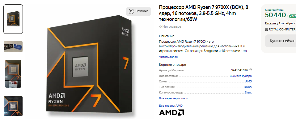 Немного дешевле, но от этого ничуть не лучше Ryzen 7 9700X. Процессор нового поколения не дотягивает до своей цены и плохо продаётся. На самом деле мы не советуем покупать всю новую линейку Ryzen 9000, о чём подробнее вы можете прочесть по ссылке.