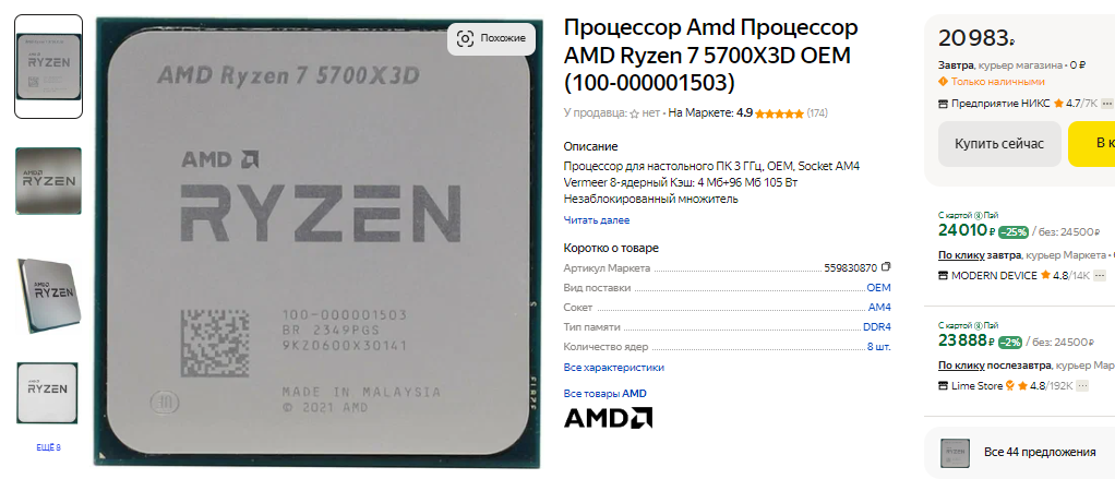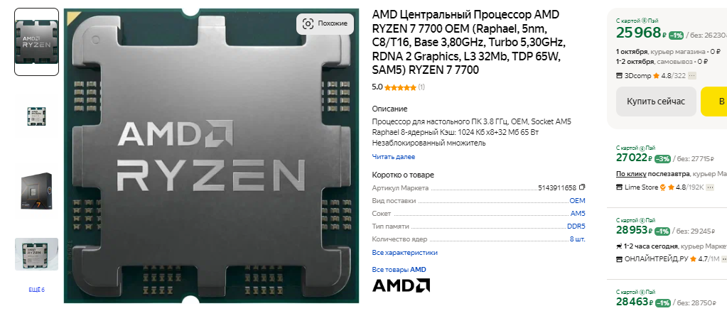 Давайте начнём с Ryzen 7 7800X3D. Ещё пару месяцев назад этот камень стоил до 45 тысяч рублей и отлично продавался. Перед нами один из самых быстрых игровых процессоров, но после релиза серии Ryzen 9000 геймеры по всему миру бросились скупать Ryzen 7 7800X3D. Возник дефицит, а российские ритейлеры не могли пройти мимо. Как видите, за 8-ядерный камень просят больше 60 тысяч, что вызывает удивление и даже улыбку. Если вы планировали купить мощный камень, который будет долго тянуть любые игры с самой прокачанной видеокартой, то брать сегодня Ryzen 7 7800X3D мы не советуем. Лучше подождать пару месяцев, ведь после выхода Ryzen 7 9800X3D стоимость Ryzen 7 7800X3D точно пойдёт на убыль.