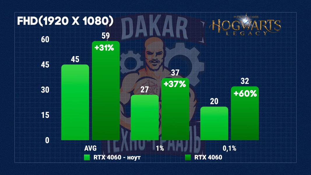 Ну и ключевым звеном сборки остаётся видеокарта. GeForce RTX 4060 прекрасно подходит для запуска игр в разрешении 1080р, а также обладает целым набором полезных технологий. Вообще, все актуальные видеокарты способны увеличить конечное количество кадров в секунду за счёт технологии масштабирования, но результат может вас немного огорчить, поскольку без компромисса в визуальном стиле обычно не обходится. Качество картинки после активации DLSS 3.0 ощутимо снижается, а включение трассировки лучей сбрасывает фармерйт до 35-45 fps. Без использования этих технологий чаще всего можно рассчитывать на стабильные 50-60 кадров в секунду. Важно понимать, что в ноутбуке GeForce RTX 4060 ограничена теплопакетом 85 Вт, тогда как настольная версия на несколько десятков Вт мощнее. Пожалуй, именно в этом и заключается зафиксированная разница до 10%. По мнению экспертов, существуют игры, которые больше других зависят от процессора. Можно сделать вывод, что Hogwarts Legacy принадлежит к числу последних, ну а с Ryzen 5 5600 наша сборка покажет всё те же 10% разницы между настольным и мобильным вариантами.