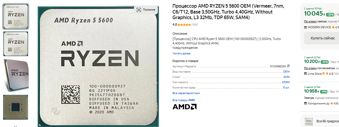 И вот здесь самое время обратить внимание на комплектующие, которые использовались для сборки настольного компьютера. Как оказалось, в ноутбуке стоял скромный Core i5−13500H, тогда как в ПК разместился Ryzen 7800X3D. Мы рады за авторов теста, ведь у них есть самый быстрый игровой процессор, вот только сравнивать такие системы нужно было с примерно аналогичными комплектующими. Таким образом стоимость компьютера оказалась намного выше, чем у ноутбука. Мы попытаемся исправить ситуацию, предложив более правильную сборку. Начнём с процессора. Остановимся на бюджетном Ryzen 5 5600, который примерно соответствует установленному в ноутбук Core i5−13500H. Скорее всего, при тесте чистой производительности, настольный вариант окажется быстрее, поскольку мобильный камень имеет ограничения по теплопакету. И всё же, это более близкий к мобильному варианту процессор, поэтому мы остановимся именно на нём. Ryzen 5 5600 даже сегодня обеспечивает нормальную скорость работы и подходит для не самой мощной видеокарты.