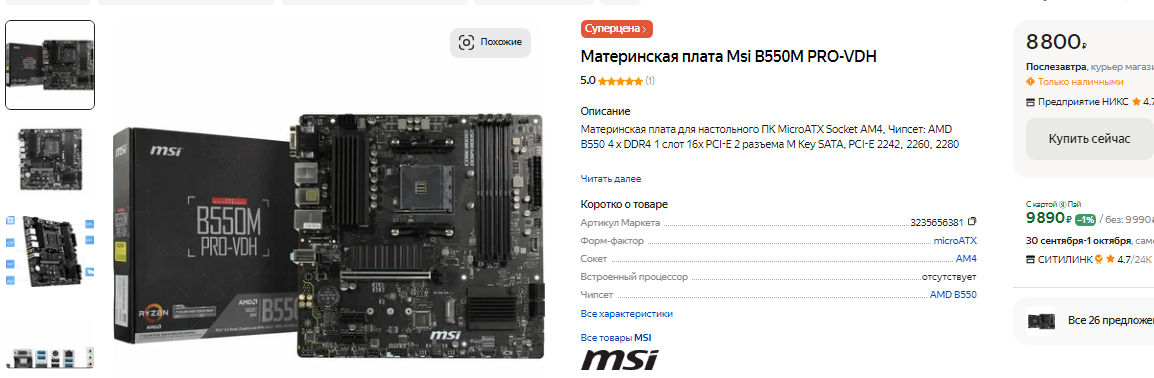 Можно было бы остановиться на бюджетной материнской плате, но мы положим в корзину Msi B550M PRO-VDH. Всё дело в поддержке интерфейса PCIe 4.0, что позволяет раскрыть потенциал видеокарта на 100%, а также обеспечить поддержку скоростных твердотельных накопителей. Во всём остальном материнская плата соответствует требованиям к указанному выше процессору и имеет все нужные слоты на корпусе. Она включает разгон оперативной памяти, но это уже по желанию конечного покупателя. Стоит учитывать, что сборка на сокете АМ4 изначально не имеет потенциала для апгрейда. Все актуальные процессоры выпускаются на АМ5, вот только ноутбуки также не подлежат замене компонентов, а главная задача заключалась в том, чтобы определить конечную стоимость сборки аналогичной по скоростным показателям комплектующим с лэптопа.