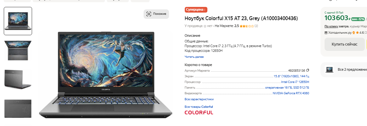 Общая стоимость сборки равняется 74 тысячам рублей. Мы не нашли на ЯндексМакркете такого же ноутбука, какой участвовал в тестах, поэтому остановились на почти таком же Colorful X15 AT 23. Разница в деталях, но на быстродействие в играх замена процессора не окажет никакого влияния. Как видите, за ноутбук просят 100 тысяч рублей, а значит мы с вами экономим 25 тысяч. Учитывайте, что в лэптопе есть встроенный дисплей, а также беспроводной контроллер для подключения интернета. Всё это стоит денег, хотя за 100 тысяч можно не только купить нормальный 27-дюймовый монитор, но и подобрать приличную мышку и клавиатуру вместе с указанным выше корпусом. В ноутбуке Colorful проблем с нехваткой питания видеокарты нет, но так бывает не всегда. В интернете можно встретить тесты мобильных GeForce RTX 4060, которые оказываются медленнее настольной версии на 30% и более. Причина в банальной экономии, ведь производитель не стал ставить нормальный блок питания, ужал в теплопакете процессор и саму видеокарту. Именно поэтому мы советуем вам обязательно изучать тесты перед покупкой ноутбука. Вдруг вам попадётся выгодное предложения, которое окажется сильно урезанным и не обеспечит нормальной производительности в играх.