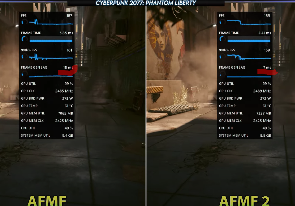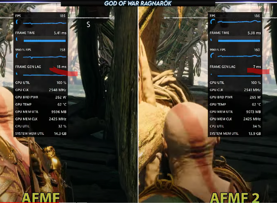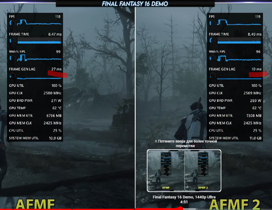 Например, FMF 2 будет работать даже в старых играх, которые поддерживают API на базе Vulkan и OpenGL. Это значит, что даже в старом DOOM 2016 года и классическом Minecraft можно добиться значительных изменений, хотя разработчики и не думали обеспечивать совместимость движков с видеокартами AMD. На самом деле есть и минусы, ведь FMF 2 совместима только с видеокартами серии Radeon RX 6000 и Radeon RX 7000. Все более ранние решения пролетают, ну а сегодня мы с вами изучим влияние новой технологии красных на реальные показатели в играх. Обратимся к ролику на канале NJ Tech. Автор использовал видеокарту Radeon RX 7800 ХТ, сравнив разницу между FMF и аналогичной технологией второго поколения. В описании теста указана другая видеокарта, но ниже в комментариях автор пишет, что забыл внести в текст правки. Оставим эту ошибку без комментариев, ведь нас интересуют результаты. Как видите, значительного разрыва между технологиями по показателю количества кадров в секунду добиться не удалось. На самом деле даже первая версия FMF отлично справлялась со своими задачами, но FMF 2 интересна показателем задержки во время генерации кадра.