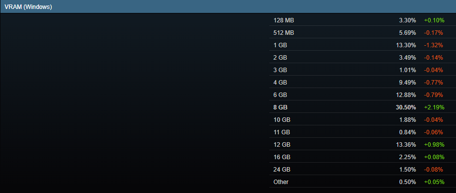Показательно выгладит статистика по количеству видеопамяти на видеокартах. Известно, что дорогостоящие модели предлагают 16 Гб, 20 Гб и 24 Гб памяти, но общее количество таких видеокарт примерно равно 3.75%. Даже с этими данными не всё так очевидно, ведь у AMD есть Radeon RX 7800 ХТ, у которой в наличии 16 Гб памяти. А между тем эта видеокарта достаточно популярна, а значит владельцев мониторов с разрешением 4К примерно столько же, как и владельцев дорогих видеокарт. Нужно учитывать, что для полноценного запуска новинок в 4К потребуется либо GeForce RTX 4090, либо Radeon RX 7900 ХТ, а значит только 1.5% от всех пользователей Steam могут похвастать 4K@60 fps на максимальных настройках графики. Но и это ещё не всё, ведь стоит владельцу такой видеокарты запустить игру в трассировке лучей, как количество кадров тут же опустится ниже 60 fps. На подмогу приходит технология масштабирования, но влияние на качество картинки здесь слишком высокое, поэтому DLSS и FSR нравятся не всем.