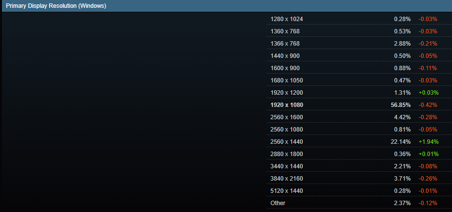 Не менее интересна статистика по разрешающей способности мониторов на компьютерах геймеров. Как видите, почти 57% всех любителей видеоигр владеют мониторами с разрешением 1080р. Если верить экспертам, то причина происходящего заключается в высокой популярности ноутбуков. Ну а в этом сегменте встретить разрешение 2К сложно, а 4К почти невозможно. Владельцы ноутбуков портят общую статистику, но получить данные только по персональным компьютерам не удаётся. Именно поэтому придётся исходить из общих показателей. Заметную динамику демонстрируют мониторы с разрешением 2К. Ещё несколько лет назад таковых на руках у геймеров было меньше 10%, ну а сегодня цифра достигла 22%. Если учитывать несколько смежных разрешений, то можно сделать вывод, что 2К распространено немного больше и доступно до 27% всем геймерам. А вот 4К и не думает набирать обороты. Ещё во время релиза настольной графики серии GeForce RTX 20 силами NVIDIA была запущена реклама, обещающая невероятный игровой опыт тем, кто купит монитор с разрешением 4К и мощную видеокарту. С тех пор прошло много времени, но количество владельцев подобных мониторов увеличивается крайне медленно.