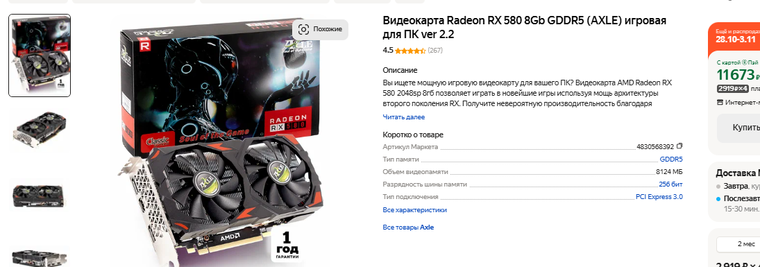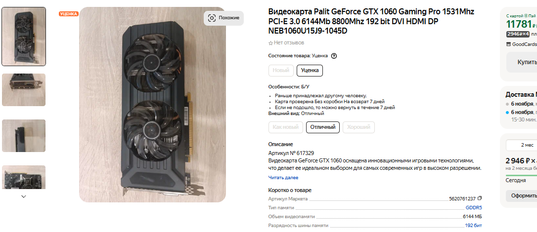 Как видите, за GeForce GTX 1060 просят около 12 тысяч рублей. Решать, стоит ли такая видеокарта 12 000 или нет, вы будете сами, ну а мы заметим, что без технологии масштабирования решения прошлых лет уже не способны запускать новые игры даже в 1080р на средних настройках графики. В данном случае мы видим, что NVIDIA сознательно отказалась от старых видеокарт, тогда как AMD поддерживает большой парк графических чипов без особых проблем. Эксперты пишут, что технология масштабирования красной команды уступает аналогичному решения зелёных. Может и так, но владельцы GeForce GTX 1060 точно не скажут Дженсену Хуангу спасибо, тогда как Лиза Су сделала всё, чтобы привлечь внимание разумных пользователей. Кстати, за те же деньги продаётся и Radeon RX 580. По скоростным показателям видеокарты равны, но последняя имеет на 2 Гб больше памяти. Несмотря на ожидания фанатов AMD, потенциал так и не раскрылся, а значит важна лишь цена и состояние. Как видите, Radeon RX 580 идёт вместе с годичной гарантией, ну а это намного выгоднее, чем покупать кота в мешке. От обмана не застрахован никто, но на ЯндексМаркете вы хотя бы имеете дело с зарегистрированным продавцом, для которого важнее репутация, чем продажа сгоревших видеокарт.
