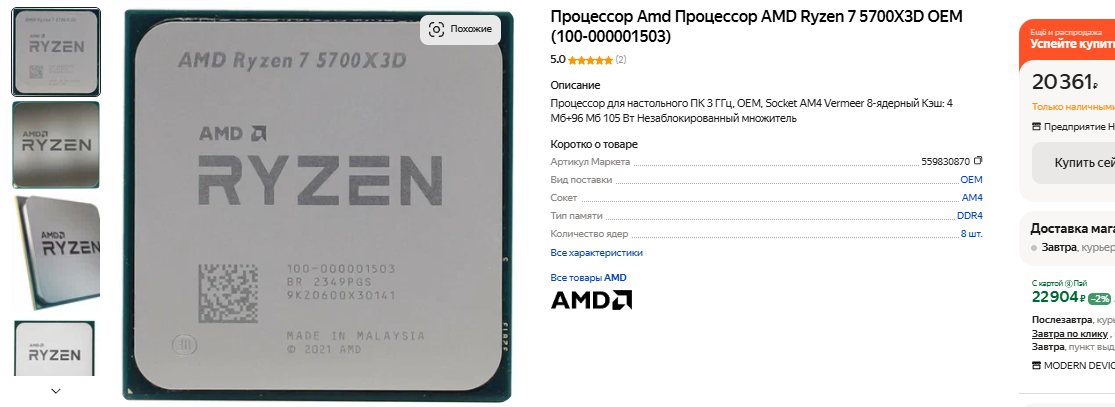 Денег за свои услуги я не брал, ну а поиск подходящего железа занял совсем немного времени. Я не знаю, купил ли этот человек компьютер на основе моих советов, хотя сборка могла получиться довольно быстрой. Начнём с процессора. Первоначально я хотел собрать систему на базе совета AMD АМ5. Идеально подходит 8-ядерный Ryzen 7 7700, но в российской рознице за такой камень просят 30 тысяч рублей. Под него потребуется материнская плата от 15 тысяч, плюс оперативная память стоит примерно в 2 раза дороже, чем я планировал потратить. В итоге стоимость компьютера оказалась бы выше 150 тысяч рублей, но конечная производительность осталась бы без изменений. Именно поэтому я остановился на Ryzen 7 5700X3D, который не только дешевле, но и позволит сэкономить на материнской плате с ОЗУ. Камень обеспечивает высокую производительность и имеет только один недостаток: он построен на сокете АМ4. Несколько лет он будет способен обеспечить достаточно высокую производительность, но заменить такой камень без покупки новой материнской платы и оперативной памяти не получится.