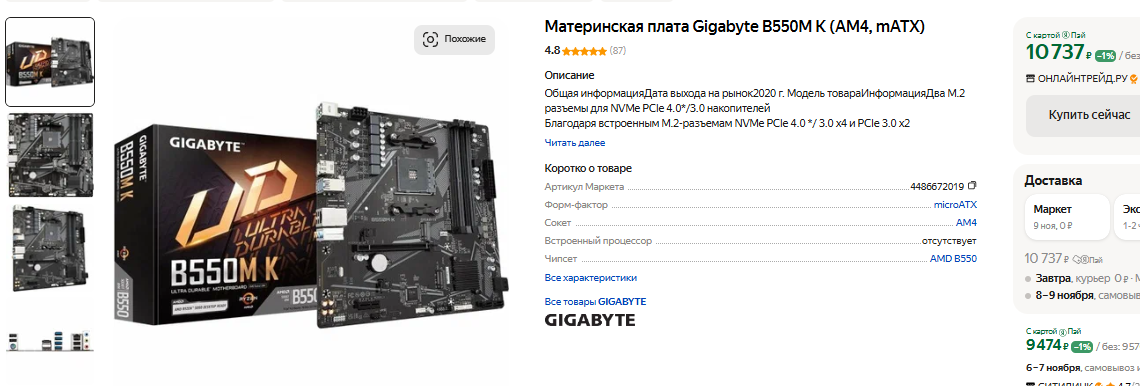 Если бы я лучше знал потребности владельца, то мог бы деть более точный совет. Здесь многое зависит от желания обновлять компьютер в будущем. Есть пользователи, которые предпочитают менять системный блок каждые 4-5 лет. Они переходят на новый сокет и получают максимальный буст за свои деньги. Такой способ позволяет добиться значительного прироста быстродействия системы в играх, но приводит к высоким затратам. Именно поэтому многие геймеры предпочитают покупать такое железо, которое останется актуальным ещё какое-то время. Указанный выше Ryzen 7 7700 принадлежит к числу потенциально выгодных с точки зрения апгрейда процессоров. Если бы я сегодня покупал компьютер, то взял бы именно такой камень, но для неподготовленного пользователя переплата в 25 тысяч рублей не очень подходит. Я не стал ставить дорогую материнскую плату, ведь в этом нет никакой надобности. В переписке с читателем выяснилось, что он не умеет и не планирует ничего разгонять в своём компьютере. Ryzen 7 5700X3D и вовсе имеет заблокированный множитель, поэтому такой фокус не пройдёт. Материнская плата Gigabyte на базе чипсета В550 идеально вписывается в наш бюджет и обладает всеми востребованными атрибутами, включая интерфейс PCIe 4.0. Она точно не подходит для энтузиаста, но в данном случае перед нами обыкновенный пользователь.