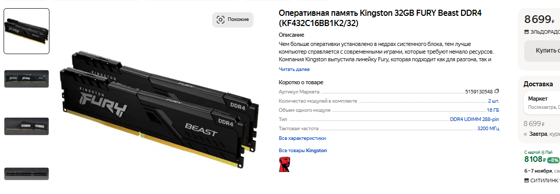 А вот на оперативной памяти экономить я не стал. Почитайте мой материал на эту тему, где проблема нехватки ОЗУ рассматривается детальнее. Суть в том, что для запуска любых игр хватает и 16 Гб, но многие авторы тестов не учитывают, что существуют ещё и потребности операционной системы. Кроме того, вам может понадобиться одновременно с игрой запустить браузер или другое программное обеспечение. Оперативная память DDR4 дешёвая, поэтому я поставил две линейки по 16 Гб народной Kingston FURY Beast. Проблем с нехваткой ОЗУ точно не будет, ну а для данной системы и потребностей владельца более дорогой комплект не нужен.