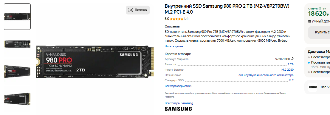 А вот на твердотельный накопитель пришлось потратиться. Я предлагал сэкономить 10 тысяч, купив недорогой, но вполне неплохой накопитель производства Kingston, но обратившийся ко мне читатель хотел взять скоростной Samsung по разумной стоимости. Что же, ничего лучше Samsung 980 PRO я не нашёл, поскольку все более быстрые SSD этого бренда ощутимо дороже. Твердотельный накопитель предлагает скорость чтения до 7000 Мб/с и записи – до 5000 Мб/с. Для любых задач этого хватит с головой, а особенно учитывая, что до недавнего времени владелец новой сборки устанавливал игры на обычный жёсткий диск. Из приятного: SSD предлагает ещё и приличный объём кэш-памяти, а также обеспечивает стандартное для такого класса устройств время работы на отказ. Объём составляет 2 Тб, ну а такого количества для нетребовательного геймера хватит с большим запасом.
