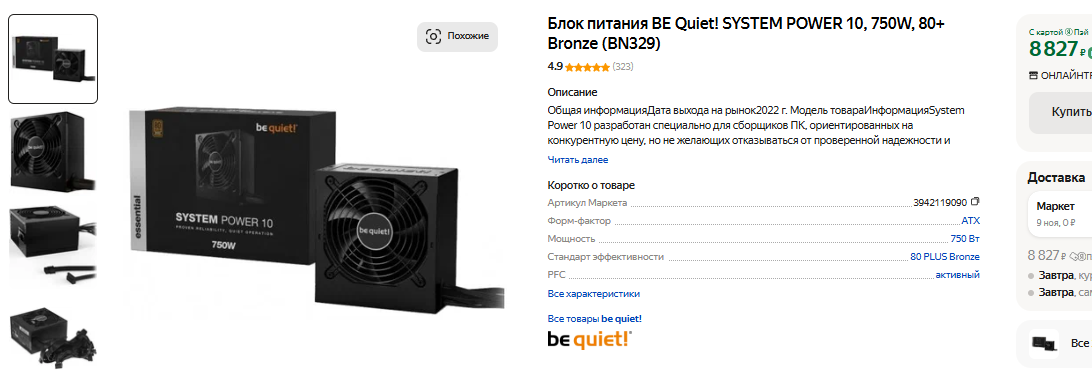 Блок питания можно было взять на пару тысяч рублей дешевле, но я решил поставить максимально надёжное железо. Чуть меньше 9 тысяч рублей просят за BE Quiet! SYSTEM POWER 10, мощность которого равна 750 Вт. Данная сборка так много не требует, но никто не знает, что придёт в голову владельцу через пару лет. Кроме того, видеокарты следующего поколения точно будет потреблять больше, чем требуется Radeon RX 7800 XT, ну а это повод обеспечить себе запас прочности на будущее. Блок питания поддерживает стандарт энергоэффективности 80+ Bronze, что можно назвать ещё одним приятным бонусом в общем зачёте. Производитель надёжный и вызывает положительные эмоции у всех владельцев блоков питания этого бренда.