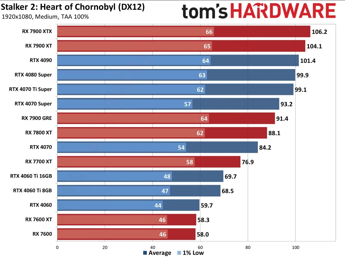 Выяснилось, что S.T.A.L.K.E.R. 2: Heart of Chornobyl чрезвычайно требовательна к железу. Вам потребуется действительно мощный процессор и прокачанная видеокарта, ну а мы изучим тестирование, проведённое командой Tom's Hardware. Доступны результаты во всех основных разрешениях дисплея, найти которые вы можете выше и ниже. Прежде всего хотим расстроить владельцев GeForce RTX 4060 и Radeon RX 7600. Средний фрамрейт на таких видеокартах приближается к 60 fps, но просадки способны приводить к неприятным визуальным эффектам. Количество кадров в секунду в таких случаях падает до 45, ну а это не совсем то, что ожидают владельцы видеокарт за 35 тысяч рублей. Следует учитывать, что первоначально тесты запускались на средних настройках графики, тогда как на макисималках результат оказался гораздо печальнее.