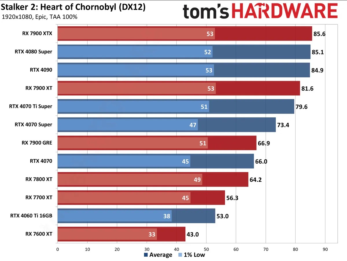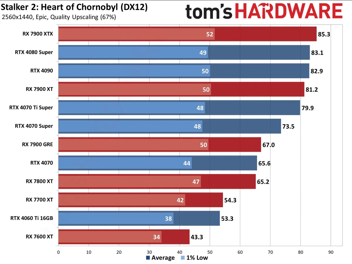 Ну и финальную точку авторы Tom's Hardware поставили при помощи тестирования с использованием технологий масштабирования. Судя по всему, времени на интегрирование сложных технологий у украинской студии не было, ведь некоторые видеокарты почти не получают никакого эффекта. Например, Radeon RX 7700 ХТ прибавила скромные 20%, хотя обычно FSR 3 даёт более заметный эффект. Если слегка снизить настройки графики, то играть в 2К с такой видеокартой, получая стабильные 60 кадров в секунду всё же возможно. Небольшой прирост от использования технологии масштабирования наблюдается и в разрешении 4К. Здесь главная победа заключается в том, что GeForce RTX 4090 и Radeon RX 7900 ХТХ обеспечивают стабильные 60 кадров в секунду.
