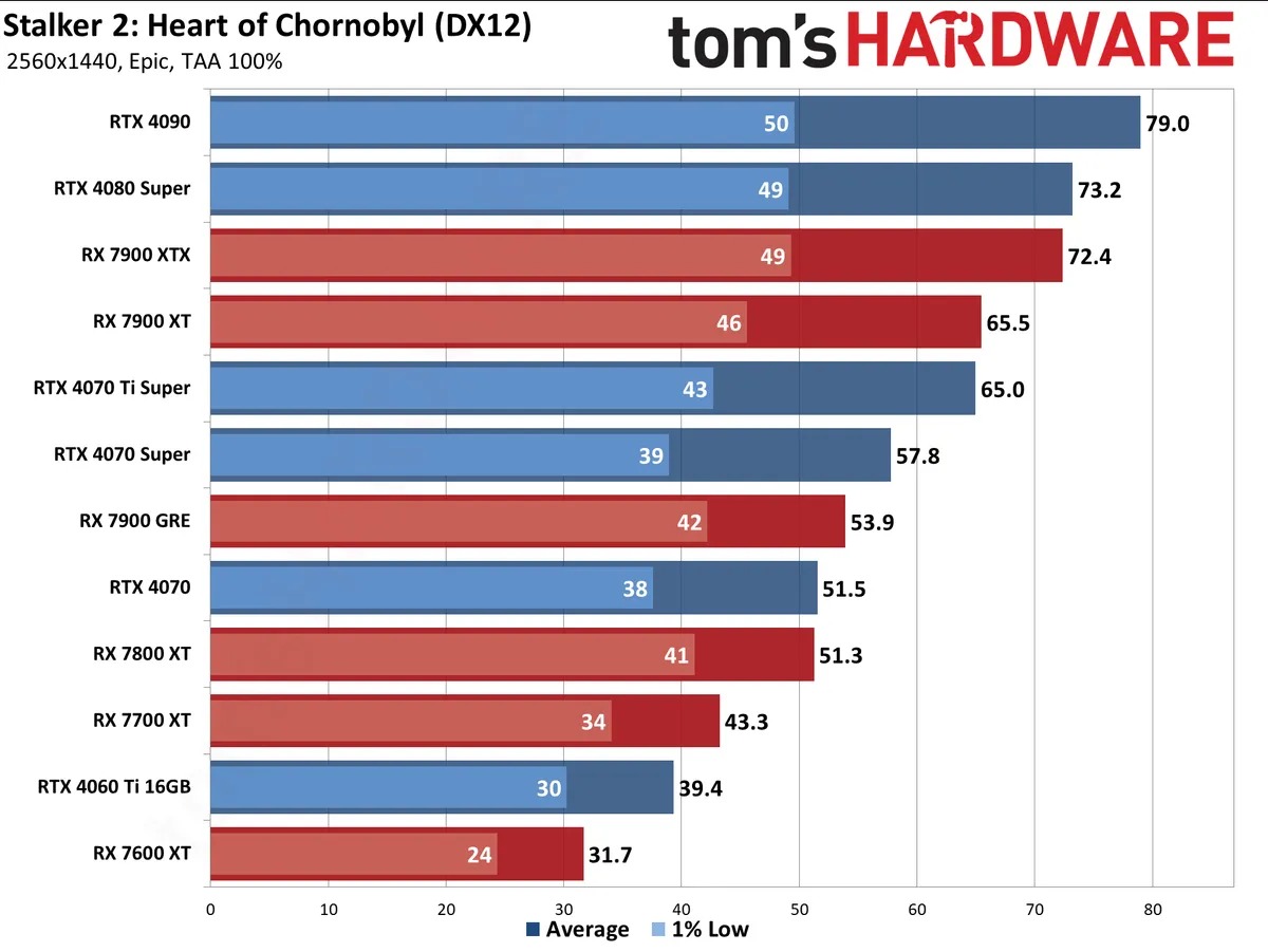 Как видите, здесь не справляются даже GeForce RTX 4060 Ti и Radeon RX 7700 ХТ. Обе видеокарты выдают ощутимо меньше 60 кадров в секунду, а особенно всё плохо, если обратить внимание на показатель 1% Low. Здесь фрамрейт и вовсе опускается ниже 40 fps, что говорит об ужасно оптимизации S.T.A.L.K.E.R. 2: Heart of Chornobyl. Обе видеокарты стоят дороже 50 тысяч рублей, ну а владельцы таких относительно мощных решений обычно претендуют на высокие настройки в разрешении 2К. Можно сделать вывод, что сотрудники студии GSC Game World не утруждали себя работой над кодом, а тесты проводились исключительно на флагманском железе.