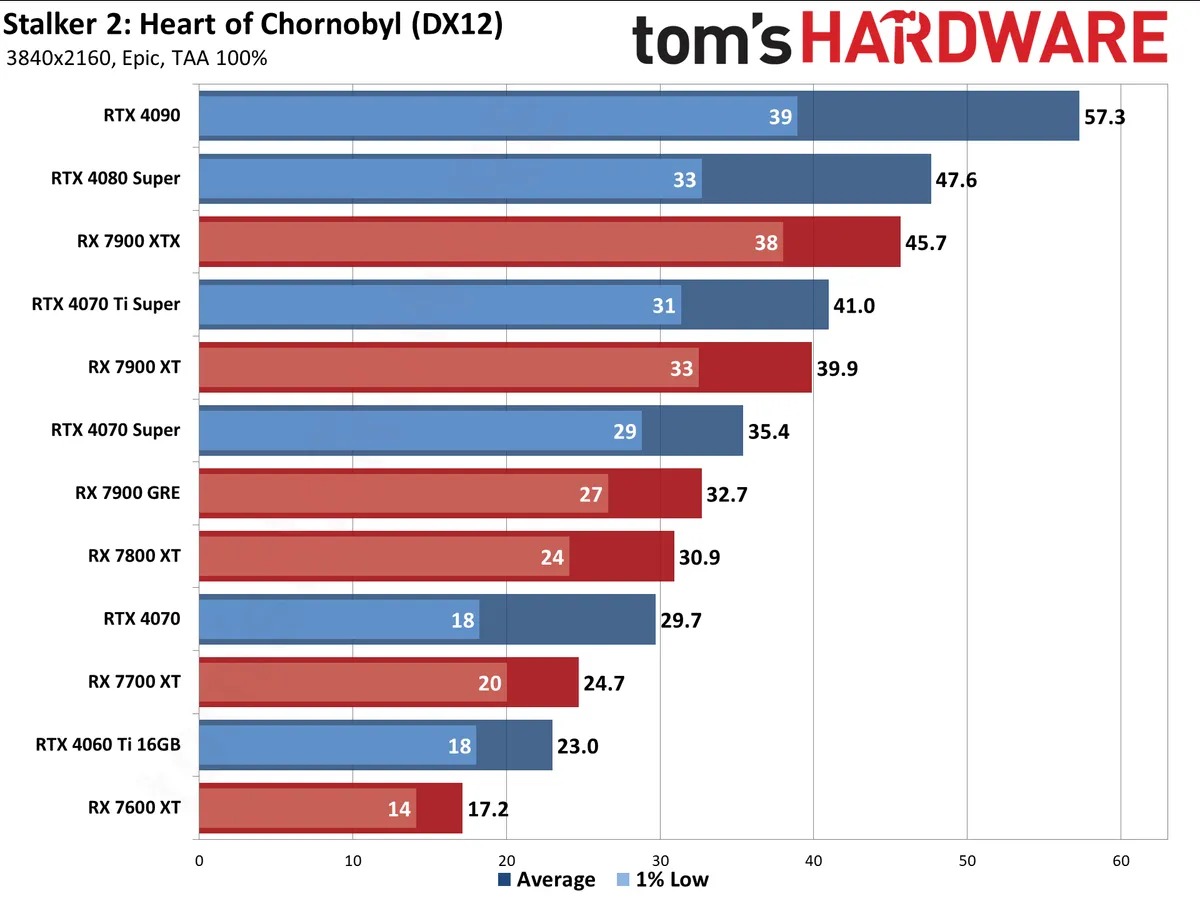 Ну и было бы неверным игнорировать разрешение 4К. Обычно владельцы видеокарт дороже 100 тысяч рублей могут запускать любые игры в сверхвысоком разрешении на высоких настройках графики, но в данном случае с S.T.A.L.K.E.R. 2: Heart of Chornobyl не справляется даже GeForce RTX 4090. Флагман, за который просят 280 тысяч рублей, выдаёт скромные 57 кадров в секунду, тогда как показатель 1% Low умудряется уходить ниже 40 fps. Перед нами очевидный провал разработчиков, ведь в данном случае мы видим, что оптимизацией никто не занимался. Владельцам Radeon RX 7900 ХТХ можно только посочувствовать, поскольку здесь количество кадров в секунду не добирается даже до 50 fps. Доступны результаты и по другим видеокартам, но в данном случае нам кажется, что видеокарт на сегодня достаточно.