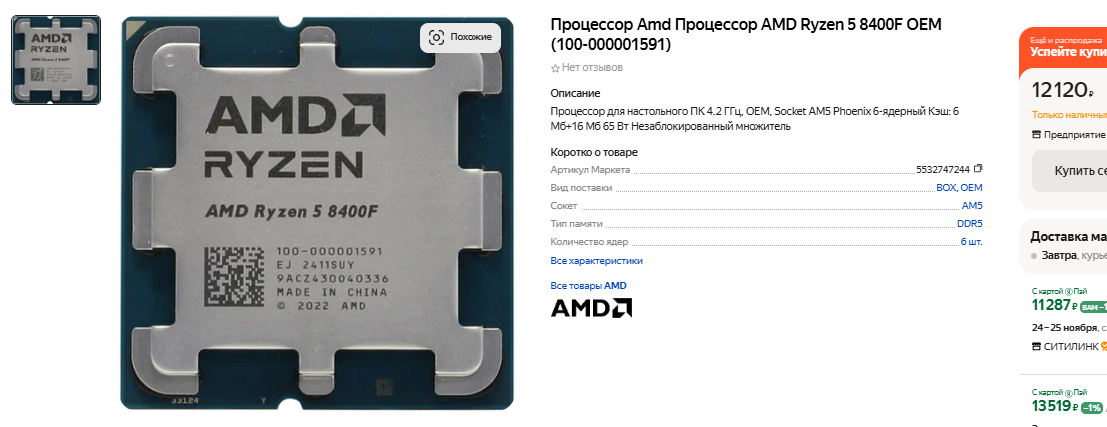 Пожалуй, оптимальным процессором, который неплохо вписывается в наши требования, может стать Ryzen 5 8400F. Если бы мы подбирали платформу для зажиточного энтузиаста, то несомненно остановились бы на более мощном процессоре, но на этот раз нам нужен такой камень, который будет выполнять все актуальные задачи без особых трудностей. Ну а поскольку мы планируем в 2027 сделать апгрейд, то нет никакого смысла вливать в компьютер слишком много денег. По ссылке вы найдёте тесты, доказывающие одну простую истину: выявить различия между процессором за 12 и 20 тысяч в играх невозможно. В синтетических тестах камни покажут кардинально разный потенциал, но в игровых сценариях будут примерно равны. Именно поэтому мы советуем остановиться на Ryzen 5 8400F, который сегодня стоит недорого, но ничуть не уступает более дорогим решениям в своём классе. Процессор получил 6 ядер и не самые высокие тактовые частоты, но зато у него невысокий TDP, а это позволяет сэкономить на материнской плате.