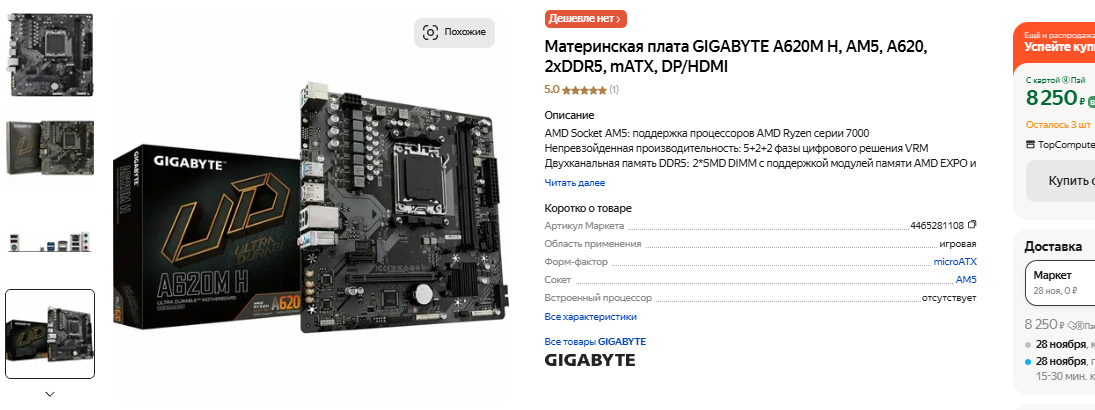 Обычно для сборки игровых ПК с поддержкой сокета АМ5 мы рекомендуем остановиться на материнской плате с чипсетом В650, но сегодня другой случай. Стоит задача собрать недорогой системный блок, в котором не будет излишеств. В данном случае более дорогой чипсет нам без надобности, ведь AMD продолжает выпуск процессоров, теплопакет которых равен или меньше 65 Вт. Остановимся на GIGABYTE A620M H. Эта компактная материнская плата без претензий на доступ к технологиям разгона, но ничем подобным заниматься обычные геймеры не станут. Плата включает все актуальные интерфейсы и поддерживает PCIe 4.0. Сегодня использовать такую технологию мы не станем, но некоторые эксперты пишут, что старые материнские платы с поддержкой только PCIe 3.0, теряют до 15% производительности видеокарт. В нашем случае ничего такого не будет, ну а это хорошая информация. Материнская плата очень недорогая, но имеет очевидный минус.