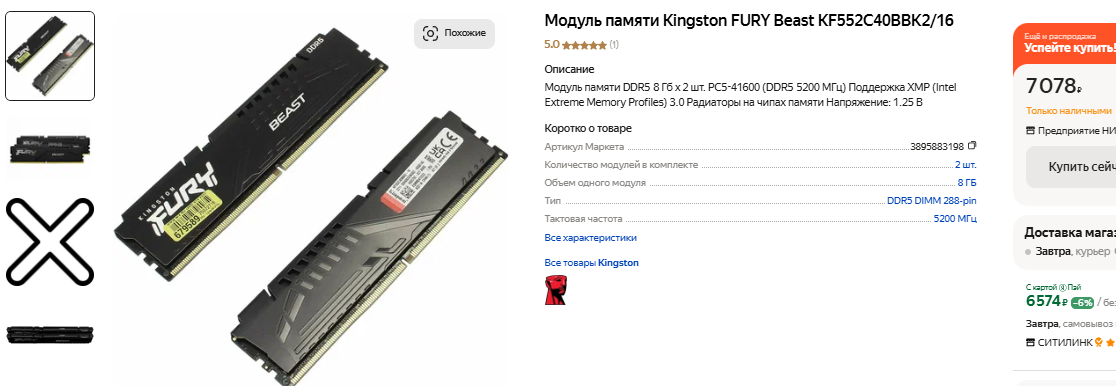 Так, она поддерживает оперативную память с тактовой частотой не выше 5200 МГц. Более дорогие платы в этом плане гораздо интереснее, но мы отсылаем вас к итогам любопытного тестирования, авторы которого приходят к важным выводам. Как выясняется, если взять видеокарту за 300 тысяч рублей, а после заменить оперативную память с тактовой частотой 5200 МГц на аналог 6400 МГц, то можно получить буст до 10%. Отличные новости для энтузиастов, вот только мы планируем экономить, я рядовые геймеры обычно не покупают видеокарты дороже 50 тысяч рублей. Именно поэтому предлагаем обратить внимание на Kingston FURY Beast. Две линейки имеют тактовую частоту 5200 МГц. Не рекорд, но учитывая специфику нашей сборки – этого будет достаточно. Можно было бы взять 32 Гб, но сегодня столько вам точно не понадобится, а в конце 2027 вы будете делать апгрейд и сможете увеличить производительность своего компьютера путём замены тех или иных компонентов. Вполне возможно, что вам захочется установить больше оперативной памяти, ну или увеличить скоростные характеристики твердотельного накопителя.