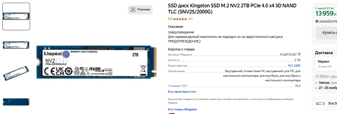 Ну а пока предлагаем остановиться на Kingston NV2. Данный накопитель отлично себя зарекомендовал и уже несколько лет считается золотым стандартом игровых и рабочих систем. Если немного поискать, то можно найти SSD, скорость чтения которых окажется в 3 и даже 4 раза выше, но многочисленные тесты демонстрируют противоречивые данные. Прежде всего выясняется, что скоростные показатели твердотельных накопителей не оказывают на производительность актуальных компьютеров никакого влияние. Существующие алгоритмы не обладают гибкостью, поэтому быстрее у вас будут только копироваться файлы между разными частями накопителя. Давайте разберём несколько различных сценариев. Допустим, вы хотите установить игру, которая физически находится в цифровом магазине Steam. В этом случае файл, размером 100 Гб, будет скачиваться ровно столько, сколько позволяет ваша скорость интернета. SSD ничего не решает, поэтому в данном сценарии не окажет на установку никакого положительного влияния. Второй сценарий: вы скачали игру с торрента, но там она располагается в сжатом архиве. Очевидно, что установка игры будет производиться на твердотельный накопитель быстрее, чем на жёсткий диск, но ключевым ограничением станет быстродействие процессоры, ведь именно он отвечает за работу с архивами. Предположим, что на SSD за 40 тысяч рублей установка игры размером 100 Гб пройдёт на минуту быстрее, но мы очень сомневаемся, что переплата этого стоит. Kingston NV2 предлагает скорость чтения до 3500 Мб/с с записью до 2800 Мб/с. Для установки и запуска игр этого даже больше, чем достаточно, ну а в будущем наличие интерфейса PCIe 4.0 позволит вам установить SSD, скорость которого окажется в 2 раза быстрее. Если захотите, ведь пока сценариев для работы такого накопителя в домашних условиях немного. Важно купить сразу 2 Тб, ведь размеры игр становятся всё больше, а указанный объём позволит записать не только игры, но и фильмы, музыку, фотографии и даже пользовательские файлы.