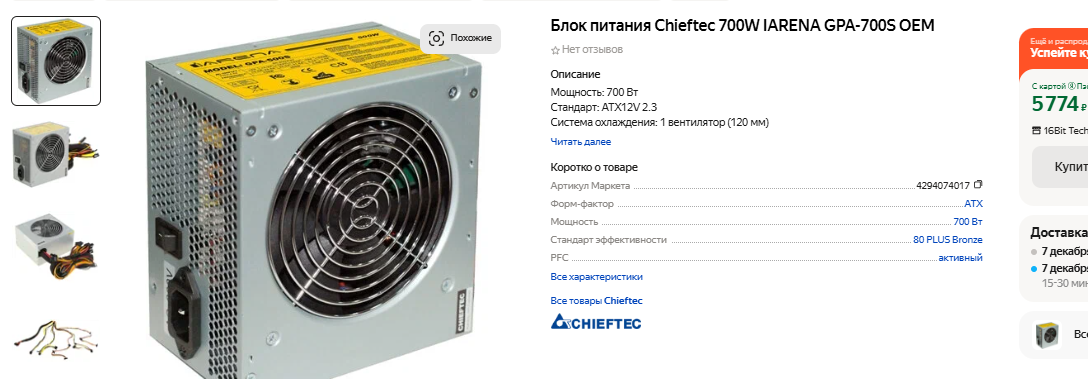 Помните, что экономить на блоке питания не следует, ведь бюджетные китайские устройства не обеспечивают нужной нам стабильности. Но и гнаться за брендами мы не станем. Именно поэтому возьмём Chieftec IARENA, мощность которого равна 700 Вт. Для нашего компьютера хватило бы и меньше, но блок питания не должен работать на максимуме возможностей. Прежде всего крупный вентилятор давит на уши. Но дело даже не в этом, ведь мы планируем апгрейд. Уже сегодня производители говорят о неизбежности повышения энергопотребления видеокарт, а значит в 2027 году дополнительная мощность нам точно пригодится. Выбранный блок питания поддерживает стандарт энергоэффективности 80 PLUS Bronze, а производитель входит в число бодрых середняков, обеспечивая высокое качество по приемлемой цене.
