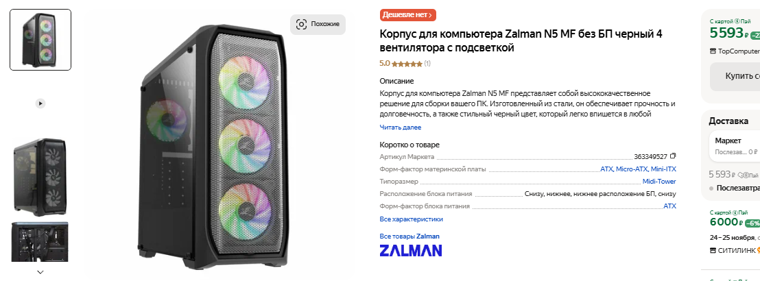 Корпус можно взять почти любой, ведь почти все системные блоки имеют достаточно места для установки наших комплектующих. Мы остановимся на Zalman N5 MF. В пользу нашего выбора говорит наличие комплектных вентиляторов. Благодаря этой составляющей можно снизить температуру процессора и видеокарты, ну а это увеличит жизненный цикл всего компьютера. Если вам не нравятся светодиоды, то их всегда можно отключить, ну а мы потратили на сборку немногим меньше 100 тысяч рублей. Если прибавить систему охлаждения для процессора, то получится ровно 100 000. Хотелось бы меньше, но с учётом стабильно падающего курса рубля вариантов очень мало. Учитывайте, что мы собрали компьютер под апгрейд, а также добились того, чтобы он как минимум 3 года оставался актуальным и мог запускать любые игры в разрешении 2К. Очень неплохо.