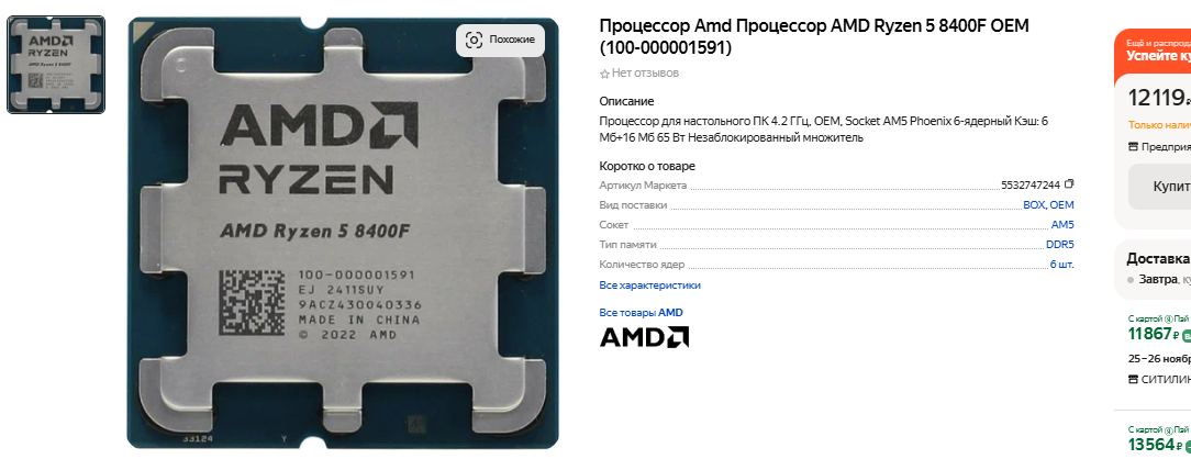 Предположим, что вы купили достаточно мощную видеокарту уровня Radeon RX 7800 XT. Что же, в разрешении 2К вы вряд ли заметите разницу между Core i7-14700K и Ryzen 7 7800X3D, хотя даже Ryzen 7 7700X отстанет совсем немного. А ведь такая видеокарта стоит довольно дорого и также доступна не более чем 5% геймеров. Рядовые же пользователи смотрят в сторону GeForce RTX 4060. Видеокарта может тянуть все игры в разрешении 1080р, но не предполагает наличия дорогого процессора. Очевидно, что брать Core i7-11700K и тем более Core i7-8700K не следует, но даже Ryzen 7 7700X слишком мощный для такого графического чипа. Обращайте внимание на решения дешевле. Например, это может быть Ryzen 5 8400F. Камень выполнен на сокете АМ5, поэтому хорошо себя покажет в плане апгрейда и будет демонстрировать здесь и сейчас приличную скорость. И не забывайте, что мощные игровые процессоры Intel последних поколения страдали от поломок. Проблема была решена, но осадок остался, а в итоге куда выгоднее купить камень AMD, предлагающий не только оптимальную производительность, но и не имеющий заметных минусов.